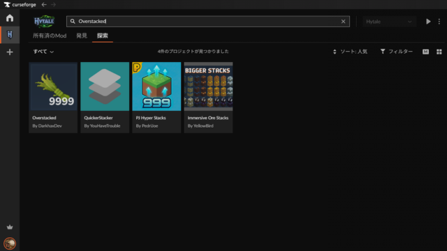 まずはインストールするMODを探します。Curse Forgeの「探索」タブを選ぶとMODがずらっと出てくるので上部の「ソート」や「フィルター」、さらには検索バーを利用してMODを見つけ出します。では今回は「Overstacked」というMODをインストールしてみます。