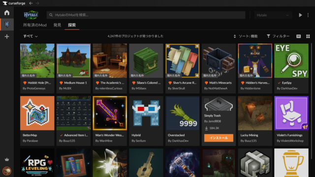 「CurseForge App」のインストールが完了したら、次はMODのインストールから有効化までを解説します。MODの検索とインストールはすべてこの「CurseForge App」から実行しますが、有効化は「Hytale」本体で行う形になります。
