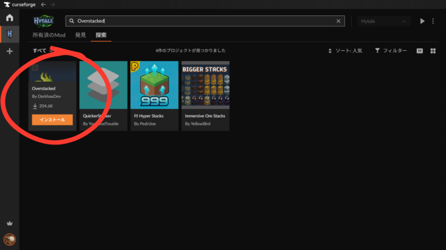 検索バーに「Overstacked」と入力してみてください。そうすると候補になるMODが絞り込まれます。