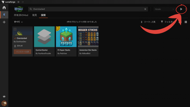 インストールが終わったら、Hytaleを起動させましょう。実はCurse ForgeからHytaleランチャーを直接起動できます。右上の再生ボタンをクリックするだけです。